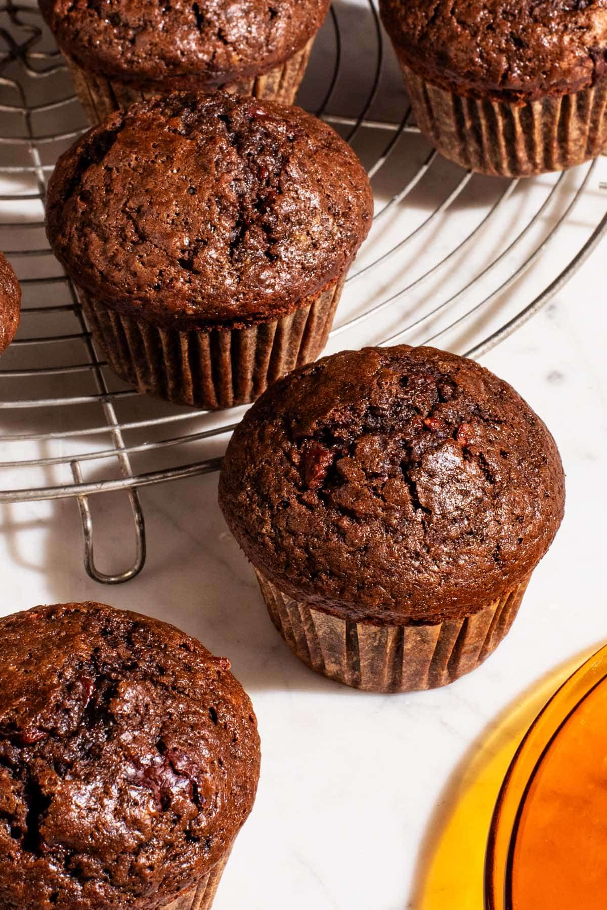 I tried a few variations of these muffins before settling on this one, with natural cocoa instead of Dutch process. It keeps the chocolate flavour a little lighter, where Dutched cocoa made them a bit too intense, and they have an excellent light texture.
